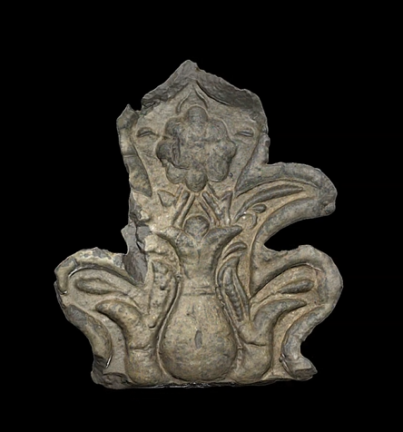 Изразец-городок красноглиняный в форме цветка лотоса с изображением вазы с букетом. Лицевая сторона покрыта белым ангобом.