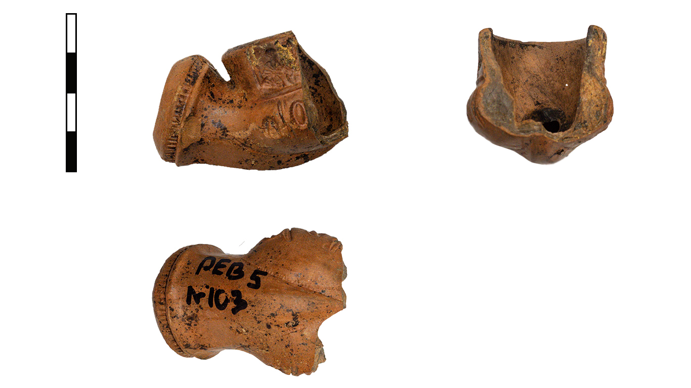Красноглиняная курительная трубка, фасон тахта-чубук. Составляющими формы является 8-гранная втулка с килем и валиком, 10-гранные чашечка и венчик, также разделенные рельефным валиком. Ребра между гранями чашечки и венчика выделены двойными разделительными линиями, ограничивающими орнаментальные поля. Орнамент на венчике состоит из 3 рядов полупальметок, обращенных вверх. Чашечка содержит орнамент, напоминающий изображение раковины-каури. Киль и валик втулки выделены штампованным изображением зубчатого колеса.