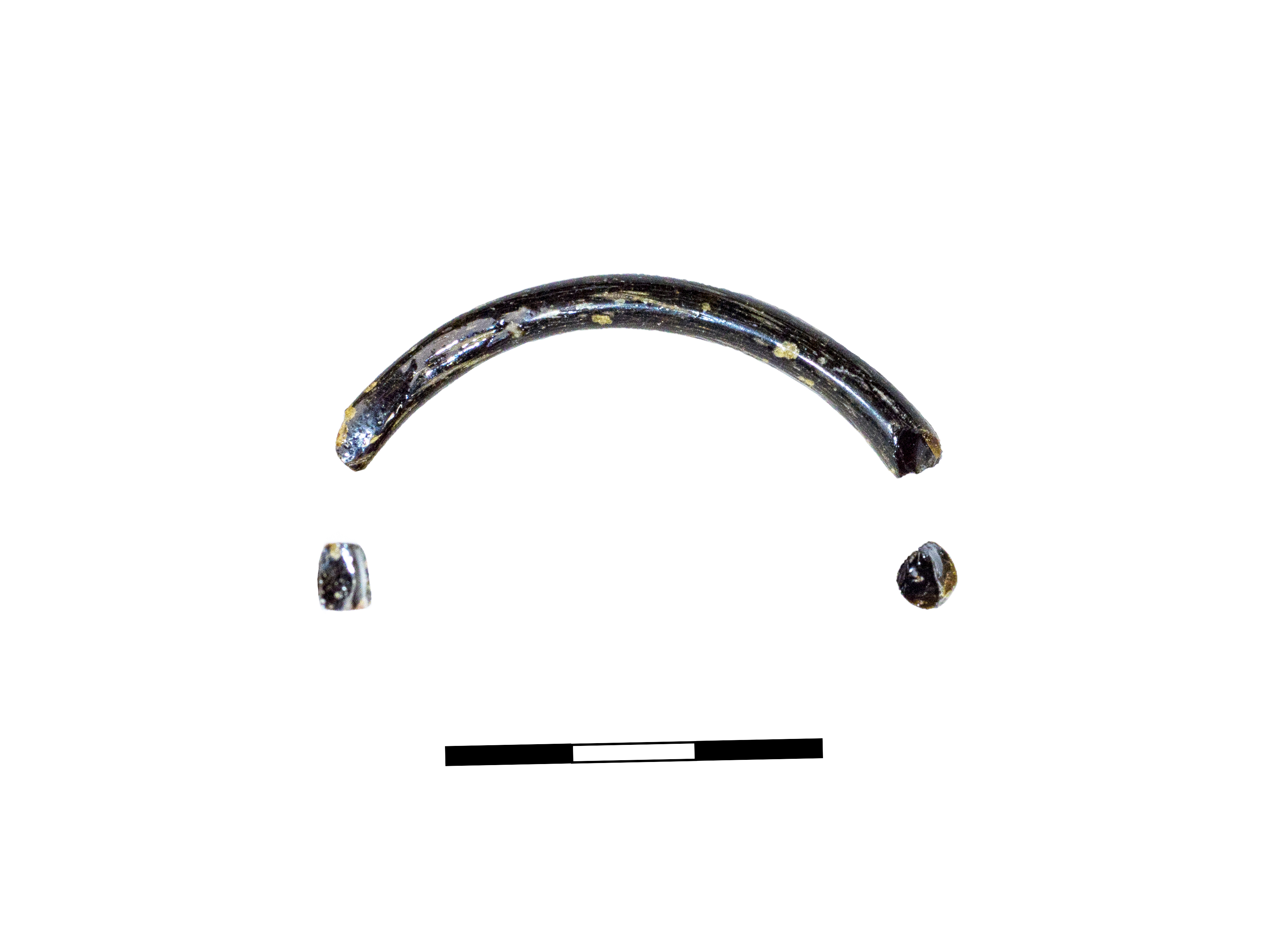 Браслет крученый ребристый из стекла оливкового цвета. Сечение в форме розетки. Диаметр обруча 6 см. Изготовлен вытягиванием дрота с одновременным кручением и дальнейшим формованием в кольцо. Поверхность патинирована.