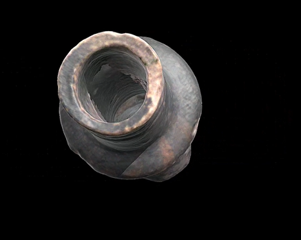 Верхняя часть подсвечника, состоящая из средней высоты стержня, в верхней части которого гнездо для свечи, отделенное дисковидным ободком, который мешал воску или салу свечи стекать на стержень. Нижняя часть отбита. У подобных подсвечников она должна была плавным переходом конической формы соединяться с «поддоном» или блюдцем.