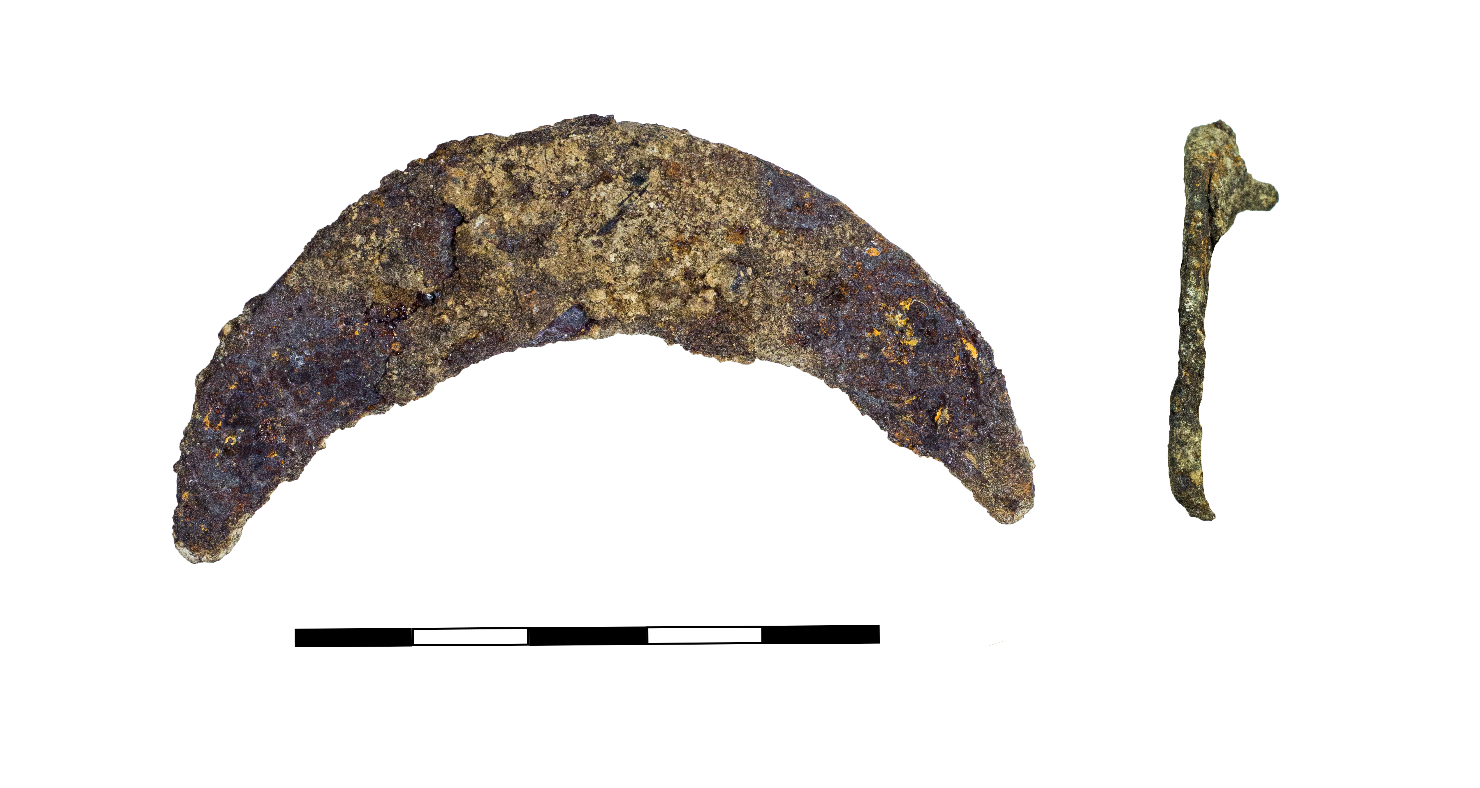 Обувная врезная подкова с тремя шипами. Сохранился только шип в центре подковы. Покрыта ржавчиной.