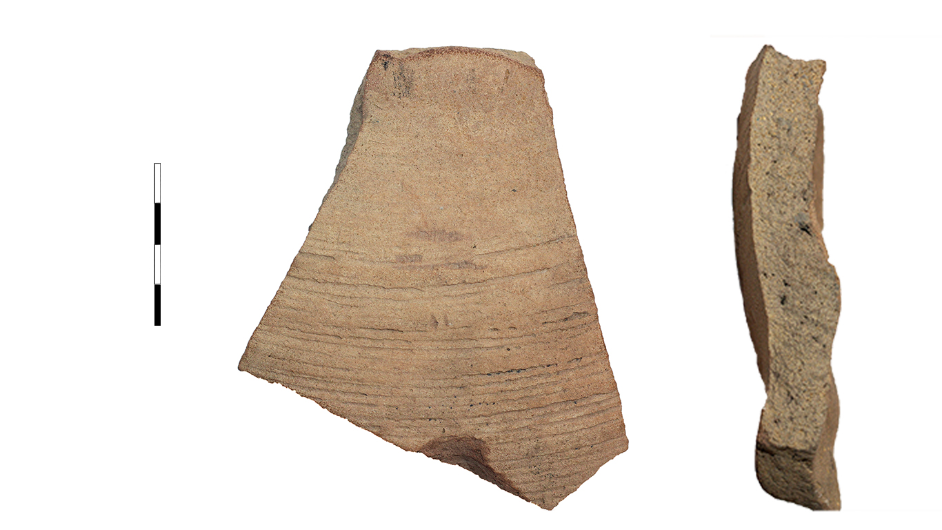 Фрагмент керамической амфоры с борозчатой поверхностью. Фрагмент относится к верхней части тулова, толщина около 1,2 см, тесто с включением мелкодробленого шамота и слюды. К сожалению, фрагментарность находки не позволяет точно определить тип амфоры и, соответственно, точно назвать место и время изготовления.