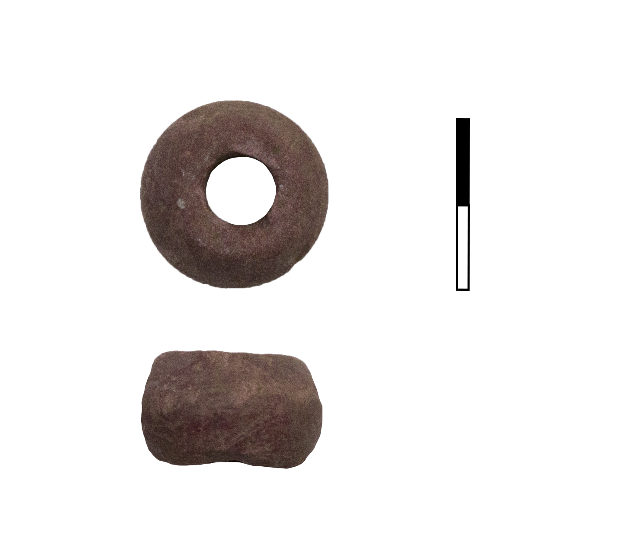 Бочонковидное пряслице из розового шифера. На внутренней части имеются потертости от нитей. На внешней – царапины.