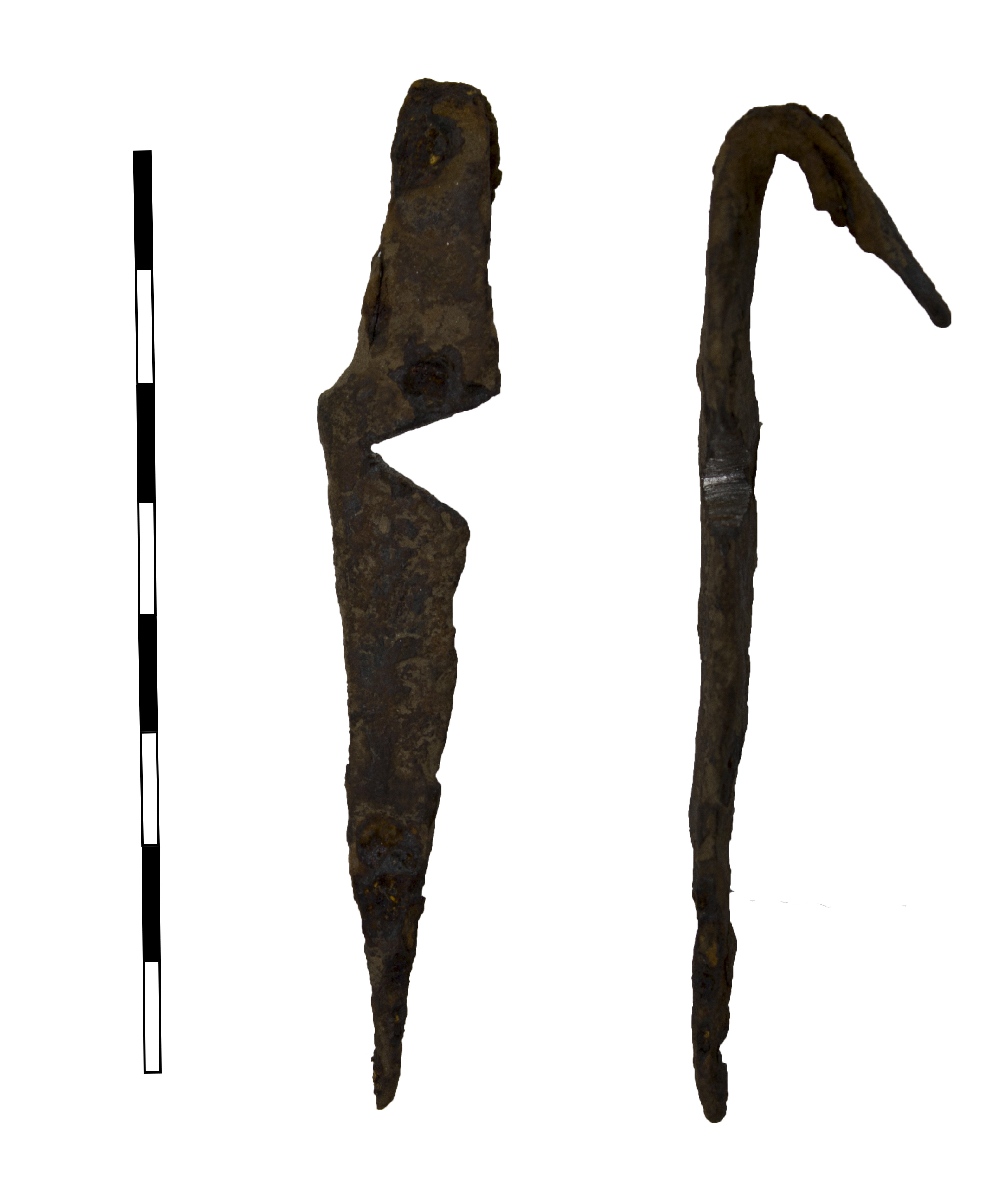 Нож универсальный с узким лезвием и согнутым черенком. По результатам металлографического анализа при изготовлении использован металлолом.