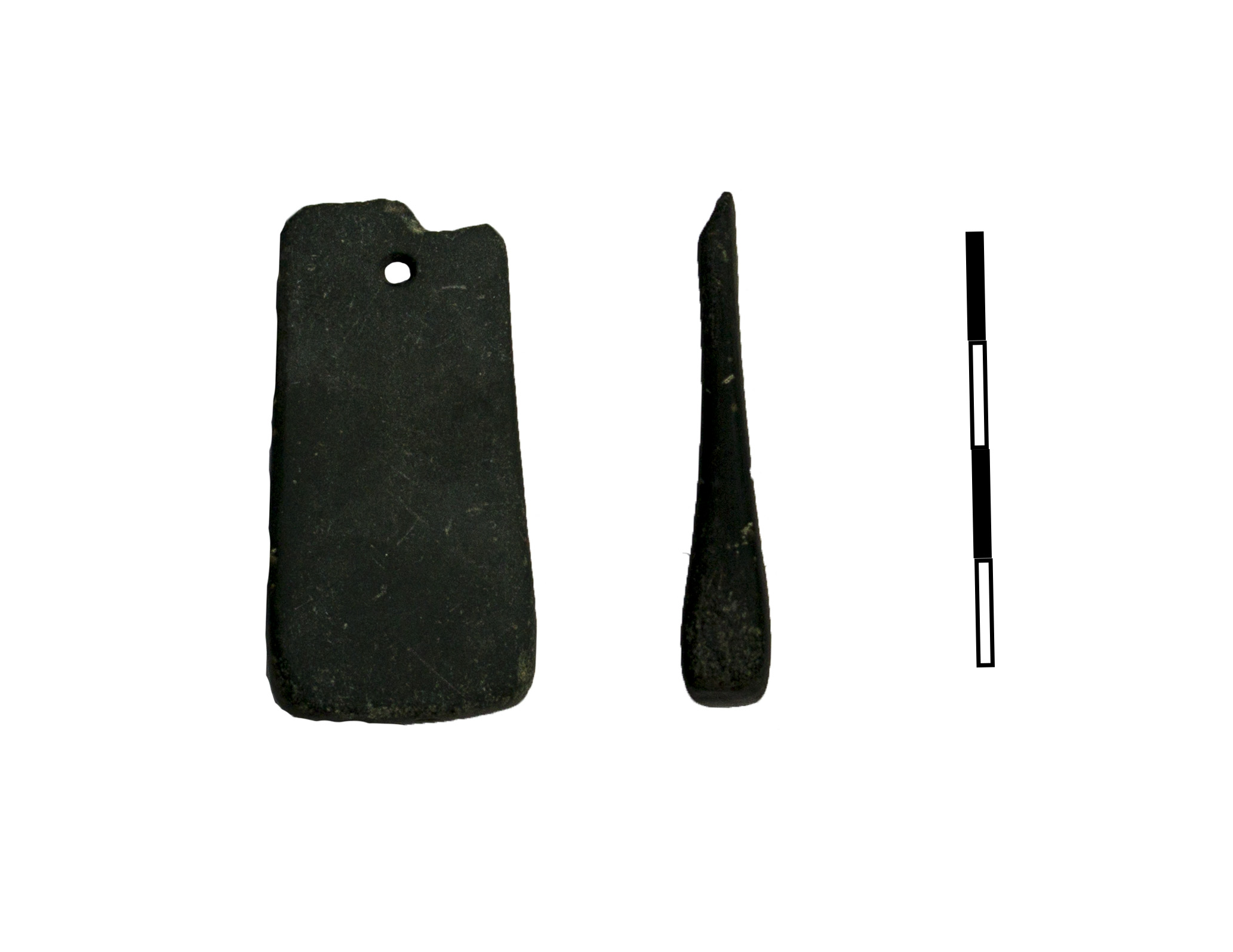 Точильный камень (оселок) плоский, трапецевидной формы с отверстием в верхней части из сланца. С его помощью производили доводку режущих лезвий, а также изготовление мелких изделий из металла.