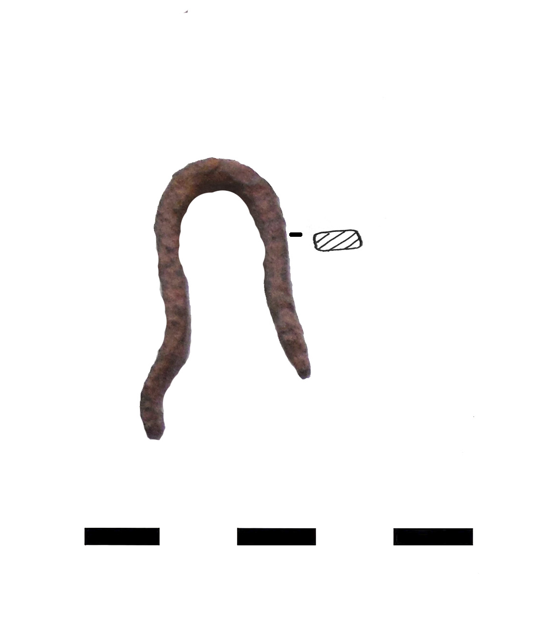 Железная скоба прямоугольного сечения., слегка деформированная. Возможно, дужка замка, тип «Б» (по В.А. Колчину)