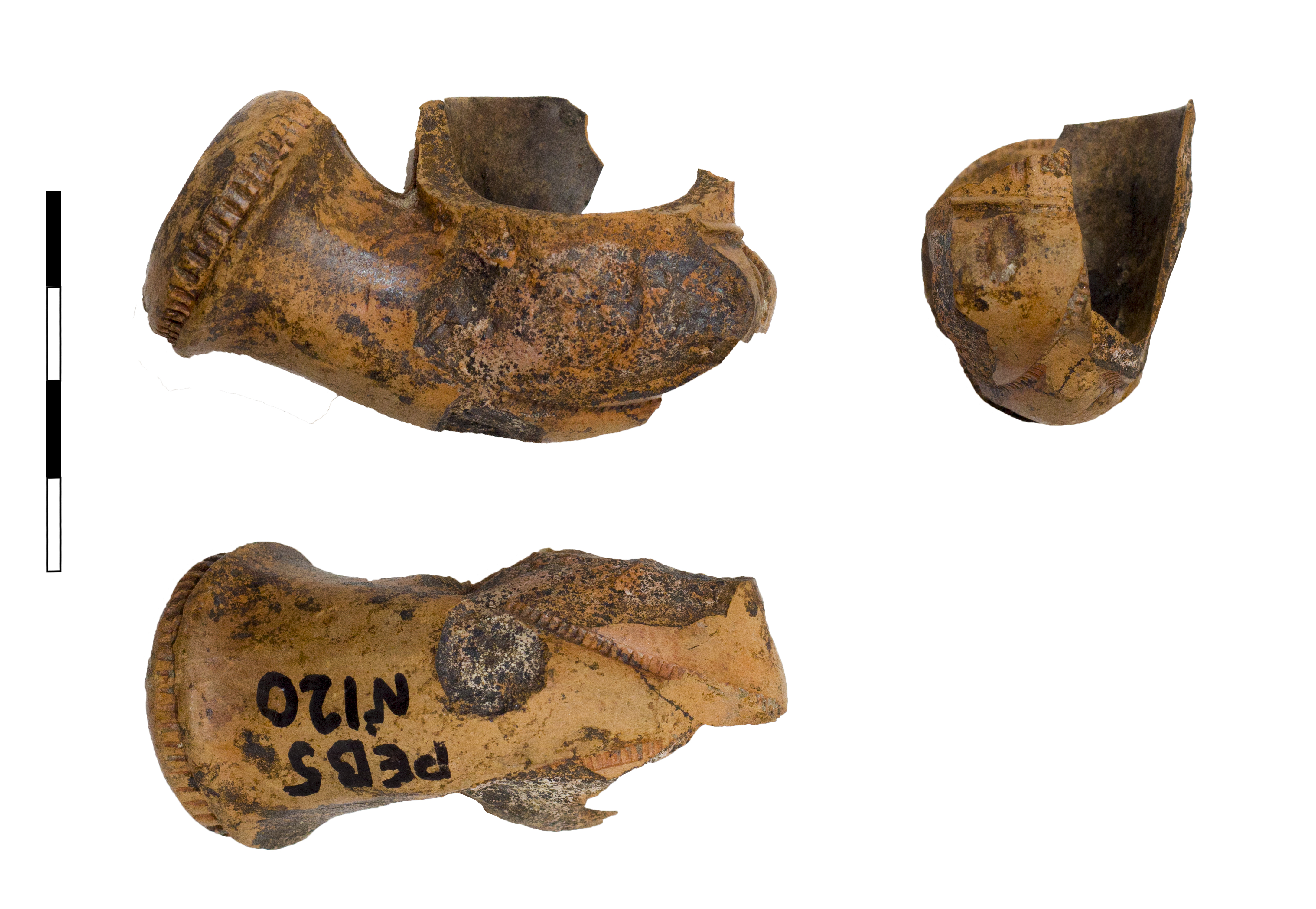 Красноглиняная курительная трубка, фасон тахта-чубук. Составляющими формы является 8-гранная втулка с килем и валиком, 10-гранные чашечка и венчик, также разделенные рельефным валиком. Ребра между гранями чашечки и венчика выделены двойными разделительными линиями, ограничивающими орнаментальные поля. Орнамент на венчике состоит из 3 рядов полупальметок, обращенных вверх. Чашечка содержит орнамент, напоминающий изображение раковины-каури. Киль и валик втулки выделены штампованным изображением зубчатого колеса.