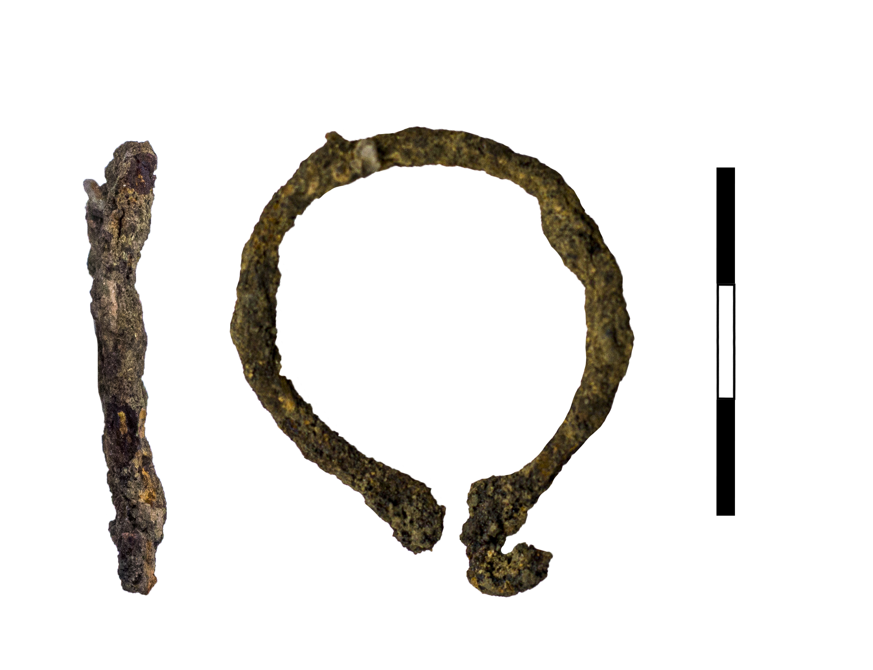 Железная застежка плохой сохранности. По форме напоминает подковообразную фибулу-сюльгаму с загнутыми концами.