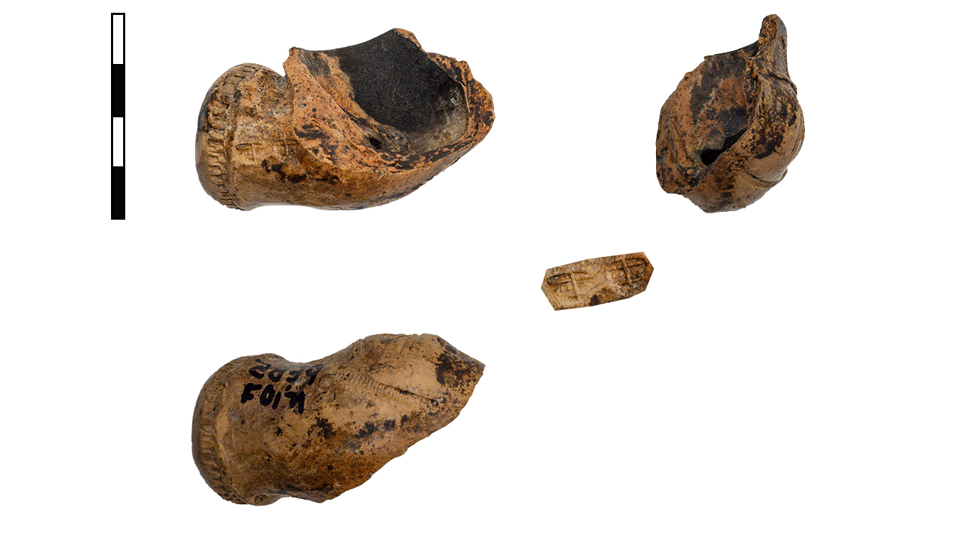 Красноглиняная курительная трубка, фасон тахта-чубук. Составляющими формы является 8-гранная втулка с килем и валиком, 10-гранные чашечка и венчик, также разделенные рельефным валиком. Ребра между гранями чашечки и венчика выделены двойными разделительными линиями, ограничивающими орнаментальные поля. Орнамент на венчике состоит из 3 рядов полупальметок, обращенных вверх. Чашечка содержит орнамент, напоминающий изображение раковины-каури. Киль и валик втулки выделены штампованным изображением зубчатого колеса.