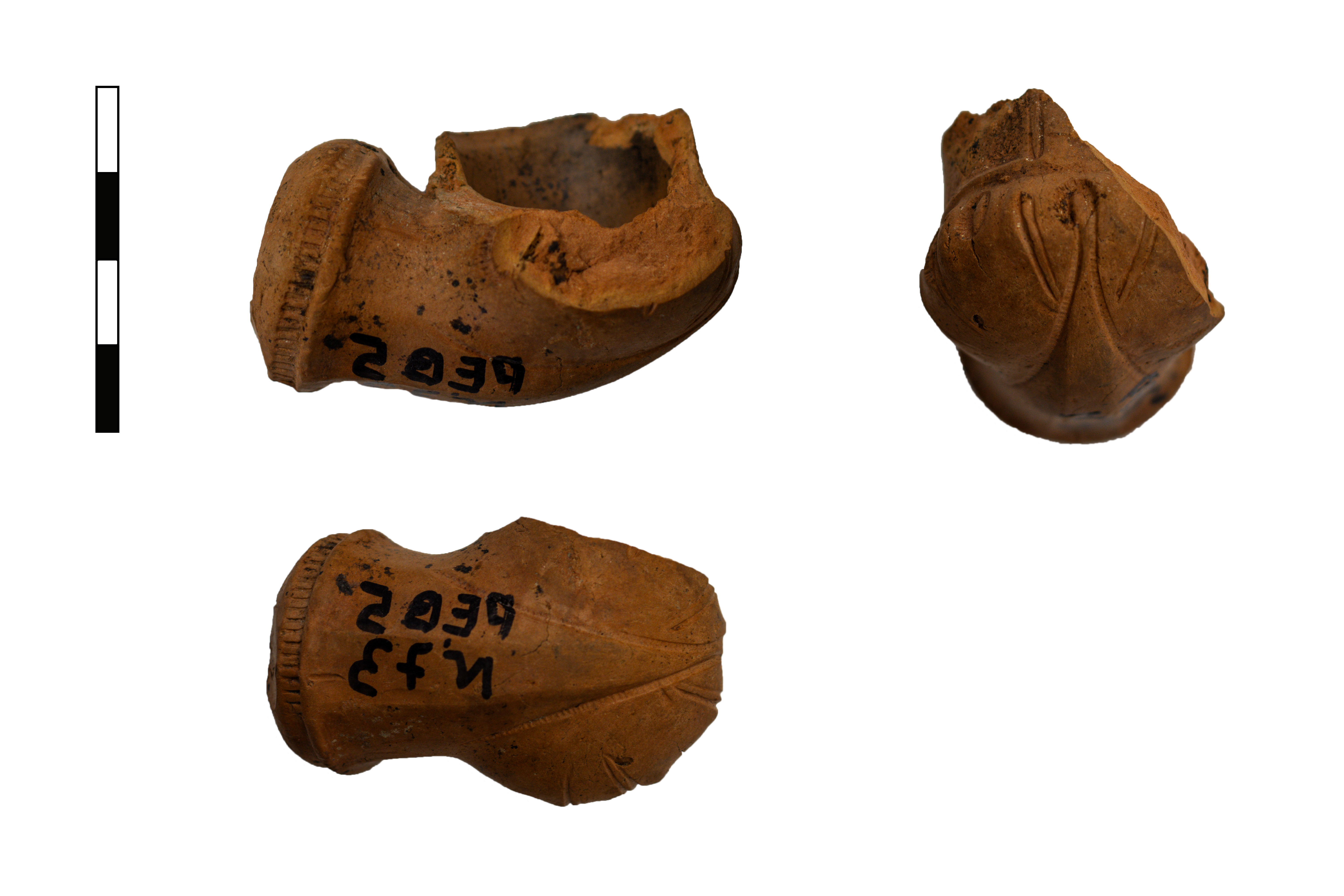 Красноглиняная курительная трубка, фасон тахта-чубук. Составляющими формы является 8-гранная втулка с килем и валиком, 10-гранные чашечка и венчик, также разделенные рельефным валиком. Ребра между гранями чашечки и венчика выделены двойными разделительными линиями, ограничивающими орнаментальные поля. Орнамент на венчике состоит из 3 рядов полупальметок, обращенных вверх. Чашечка содержит орнамент, напоминающий изображение раковины-каури. Киль и валик втулки выделены штампованным изображением зубчатого колеса.