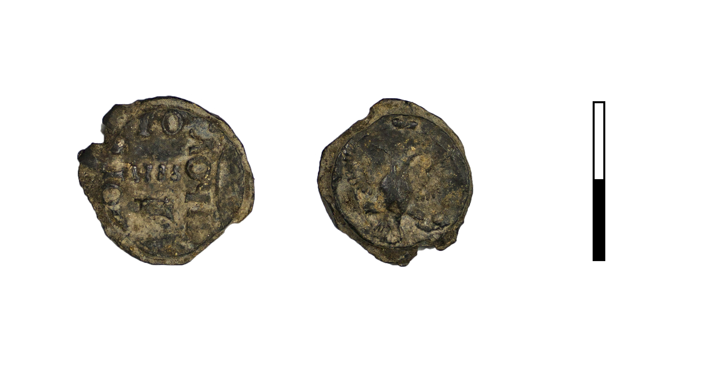 Таможенная свинцовая пломба. С одной стороны изображение двуглавого орла, а с другой – по центру год (1785), под ним – годовой знак – наковальня, по кругу название таможни. К сожалению, большая часть надписи утрачена.