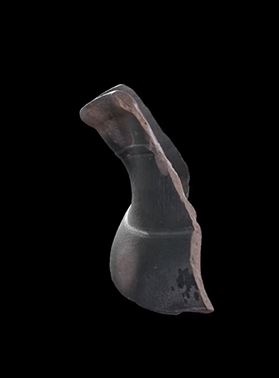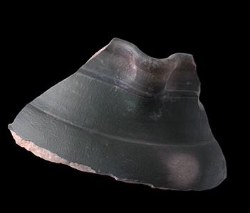 Фрагмент керамического кувшина с носиком-сливом. При изготовлении посуды такого типа использовалась обычная красная глина. Поверхность сосуда перед обжигом лощилась, т.е. выглаживалась при помощи гладкого камешка, металлического или костяного лощила. Лощение уплотняло стенки сосуда, делало его более прочным. В самом конце обжига в гончарный горн клали смолистые сосновые дрова, тряпки или траву для получения густого черного дыма. После томления в задымленном горне сосуд получал глубокий черный цвет. На бархатистом черном фоне следы лощения отливали стальным блеском.